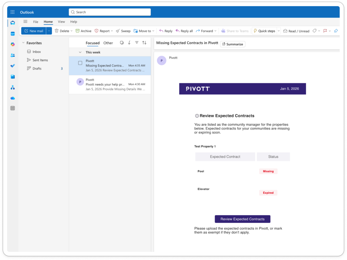We’ve added two new automated email reminders in Pivott to help you quickly see which contracts and properties need attention, without adding extra work to your day.